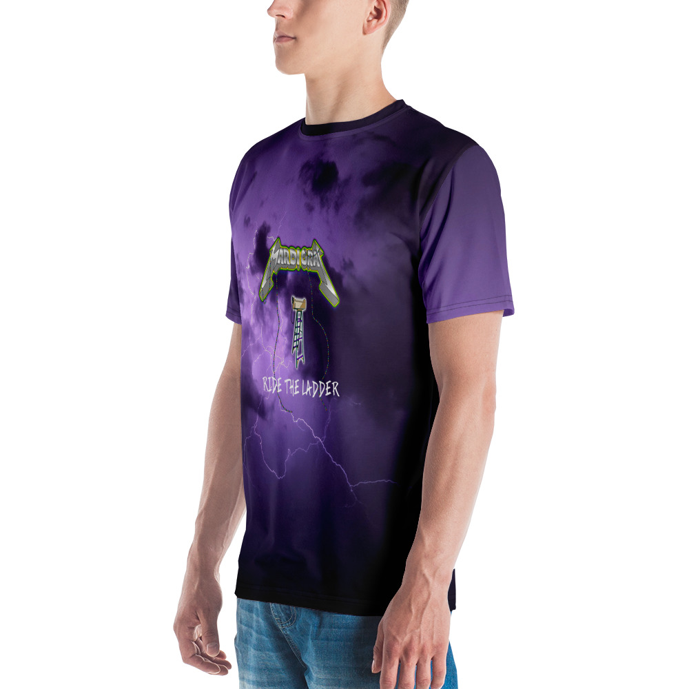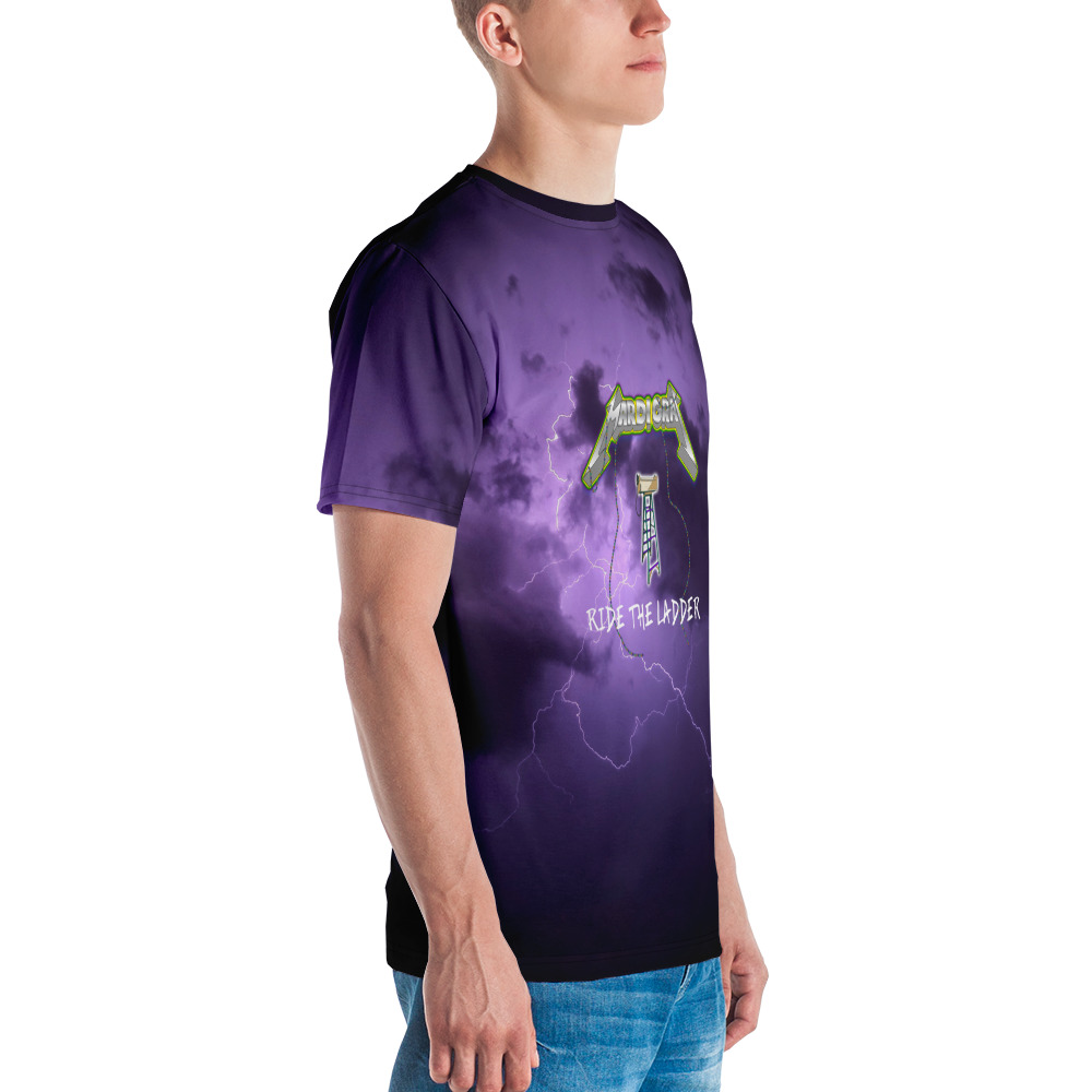 The “Mardi Gras” inscription blazes across the chest in a striking green, heavy metal typeface that pulses with a neon intensity, while a stark ladder motif stands at its core, embodying the high-octane thrill of the festivities. Below, “Ride the Ladder” is slashed in a defiant script, beckoning the bold to ascend into the heart of the Mardi Gras madness.